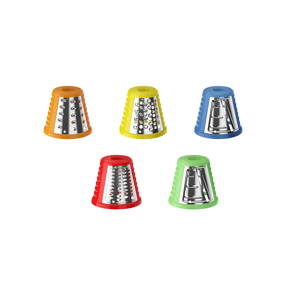 Моторный блок, блок овощерезки, мелкая терка, крупная терка, терка-измельчитель, шинковка для тонких ломтиков, шинковка для крупных ломтиков, органайзер для хранения сменных насадок, толкатель, руководство по эксплуатации, гарантийный талон